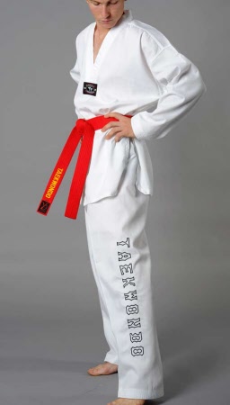 The label in the front of the dobok is now black. The pants is composed to an elastic waist, draw string, TAEKWONDO embroidery on the side of the pants, quality sewing down at the bottom of the sleeves and legs of the pants.
