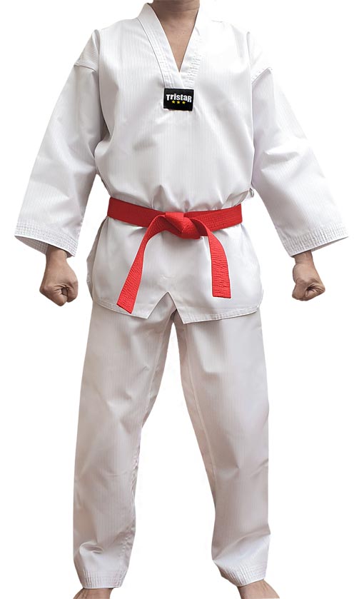 80/20 polycotton, 8 oz fabric , this white collar dobok includes