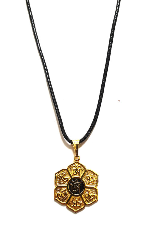 Pendentif tibétain avec le symbole Om inscrit en tibétain, et le mantra bouddhiste Om Mani Padme Hum autour